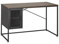 Touch up your home office with this modern-looking desk. The piece comes with a cupboard with shelves that guarantee enough space to organise all your documents and stationery. Moreover, the door of the compartment is decorated with a see-through, metal mesh that adds an industrial touch to the design. The desk features a top with a wood-like finish which, along with its compact size, makes it fit in any place of your liking.
